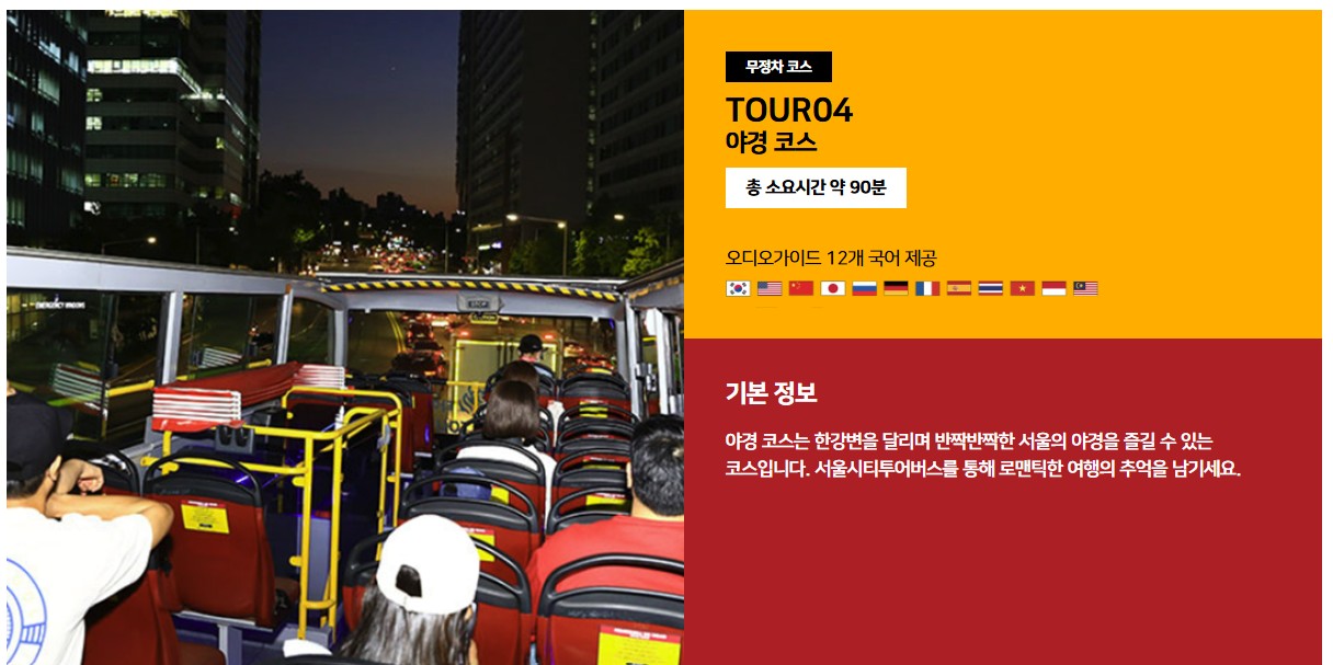 - 배차 간격: 약 30~40분 - 야경코스: 오후 7시 30분 출발 (1일 1회, 지정 좌석제)