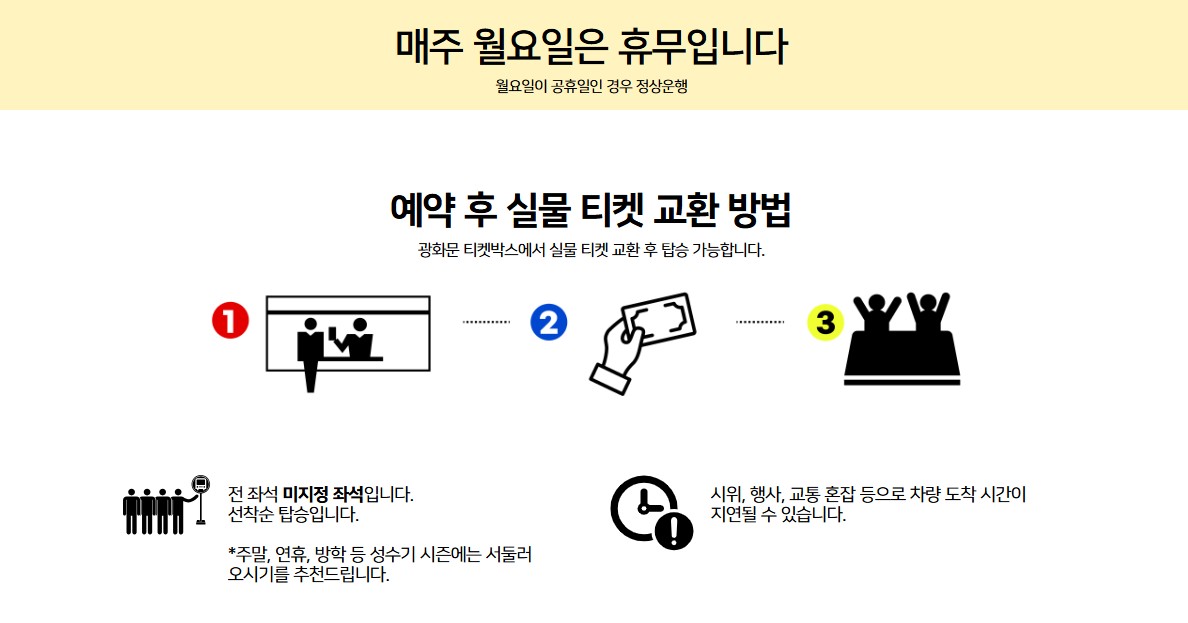 ※ 매주 월요일은 정기 휴무이지만, 공휴일인 경우 정상 운행되니 참고하세요.